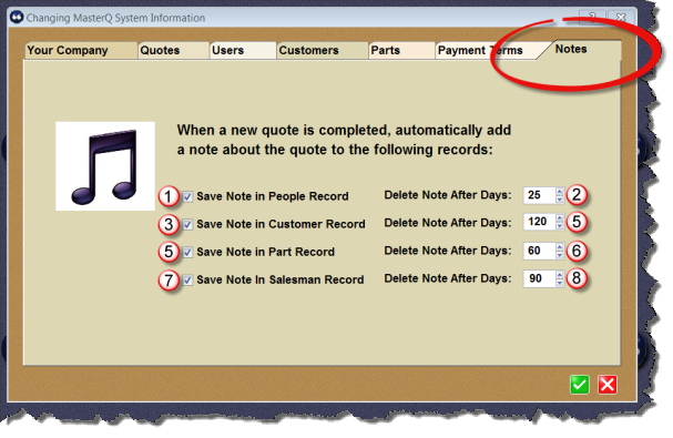 Each time a quote is created, MasterQ has the opportunity to automatically create a note about the quote and attach it to the People, Customer, Part and/or Salesman records. Each of these notes include a button that will quickly open up the related quote for review. The Notes Tab controls which notes are created and how long they are kept before being automatically deleted.