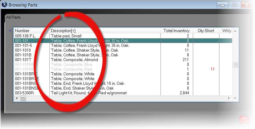 Items are listed in a particular order. For example, when you browse parts, the items are listed in part number order.