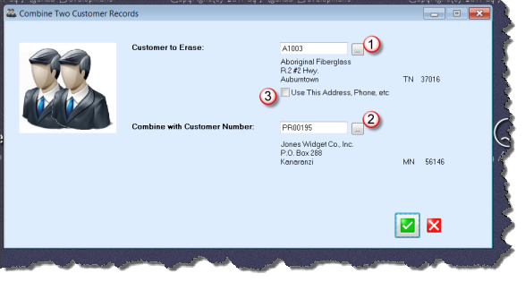 The customer that will remain is selected by pressing  . The name, address, phone numbers, etc will be from the customer you have selected in  . If you wish to use the information from the first customer, check the Use This Address, Phone, etc check box  .